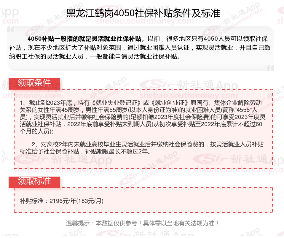 今天聊一下4050补贴的相关内容。4050补贴听起来像是一个针对特定年龄人群的社保补贴。比如女性需年满40周岁,男性需年满50周岁(以申请当年12月31日为截止日期)。那么黑龙江鹤岗4050灵活就业困难人员社保补贴多少钱?黑龙江鹤岗4050社保补贴可以申请吗?接下来随新社通APP小编具体了解一下4050社保补贴内容。