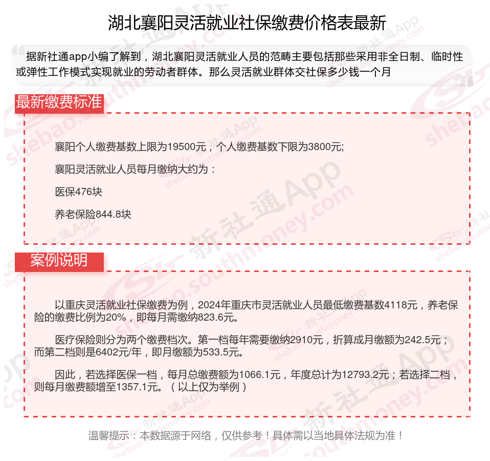 湖北襄阳灵活就业人员的社保缴费标准是多少?根据新社通app-社保缴费查询工具提供的最新数据如下:
