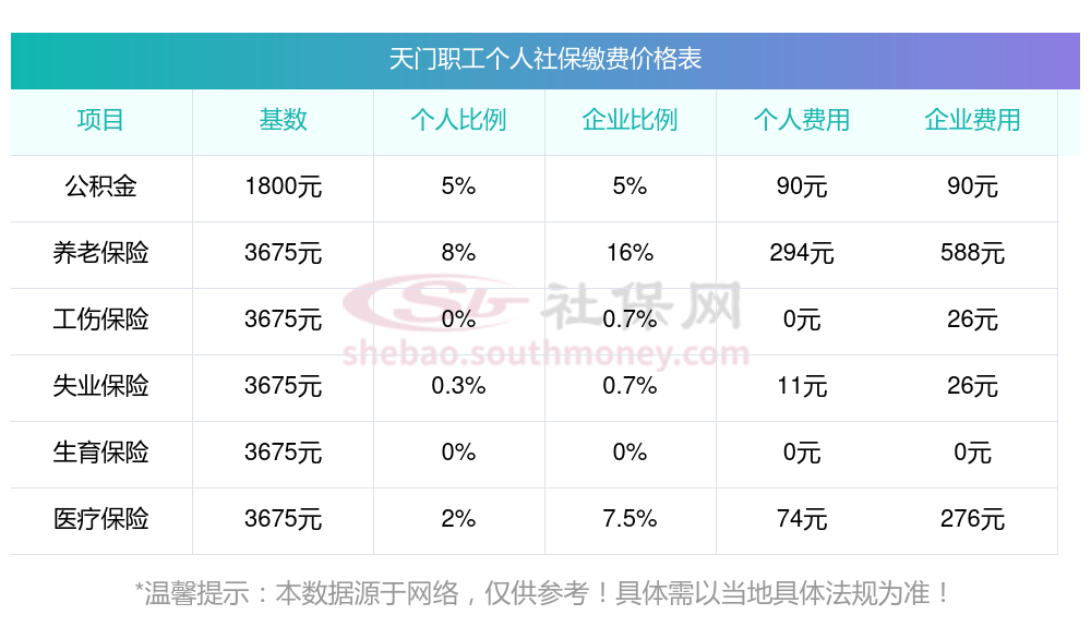 2025年社保缴费价目表,下面和社保丫丫一起来了解下2024-2025年天门最低配社保费用明细参考,新社通app-社保缴费查询工具提供的最新数据如下:
