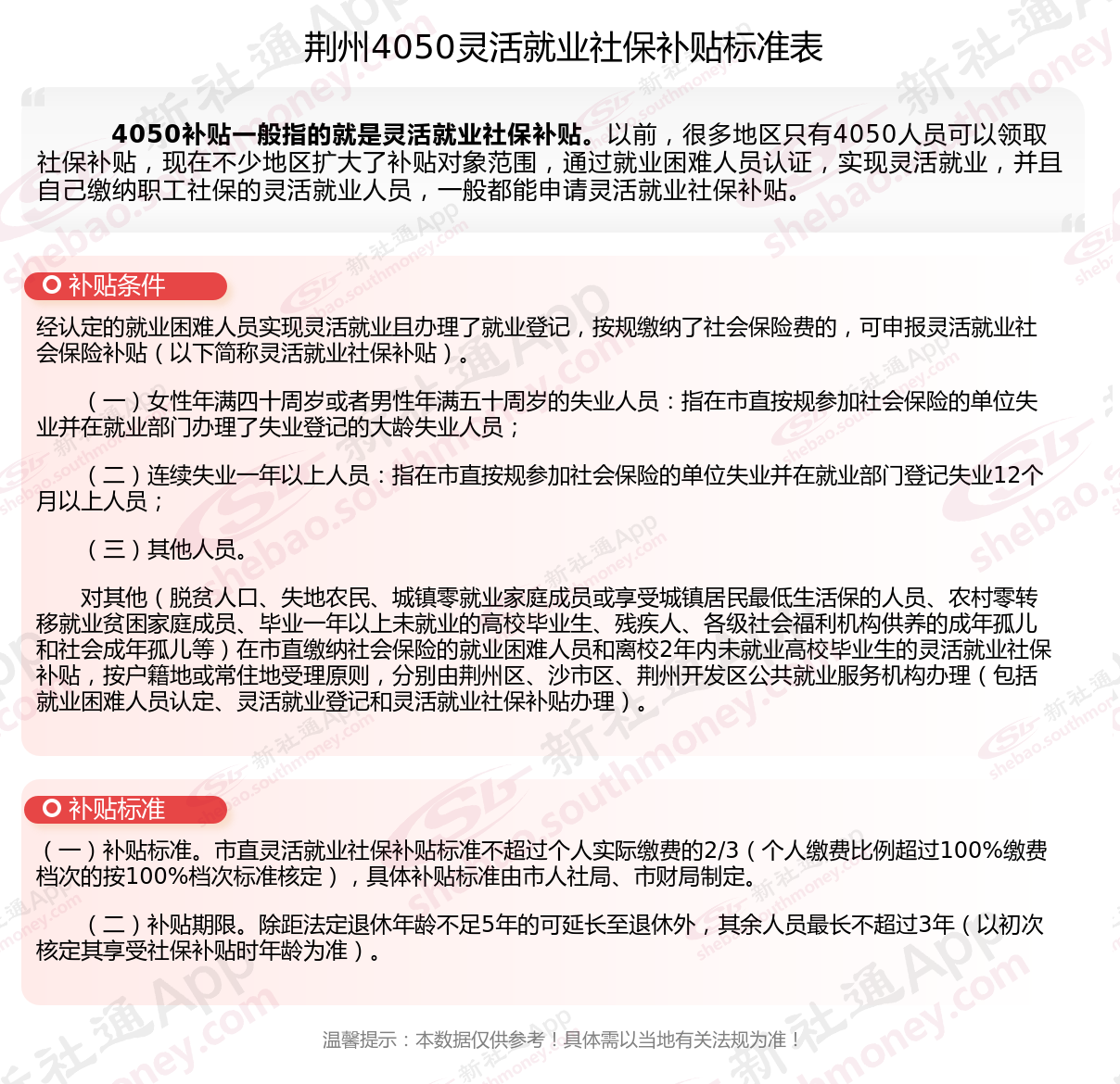 2025荆州灵活就业4050社保补贴是一项面向特定年龄段的就业困难人群的社会保险补贴。