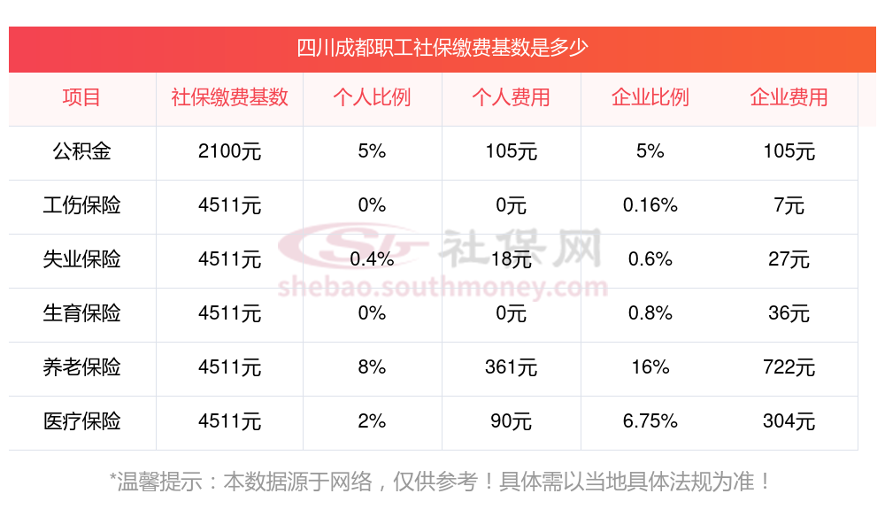 2025年四川成都5险缴费标准,2025年四川成都社保缴费多少钱?下表是2025年四川成都社保费用明细参考,新社通app-社保缴费查询工具提供的最新数据如下: