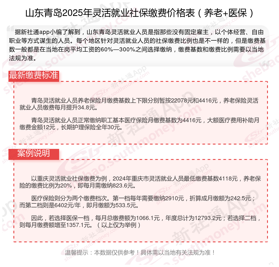 据新社通app数据显示,山东青岛灵活就业人员养老缴费基数2024-2025年最新标准如下: