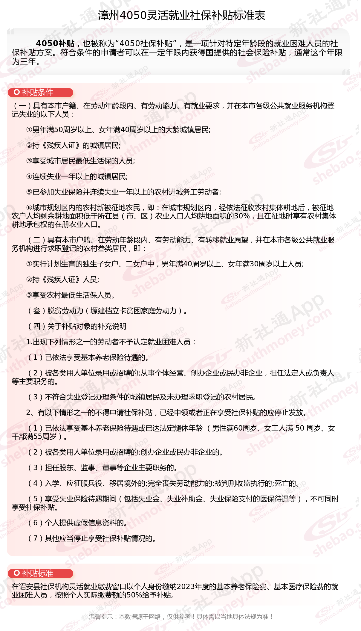 二、2025年漳州4050社保补贴标准及条件,最新如下: