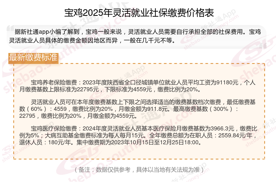 2025年宝鸡城镇职工社会保险缴费基数用人单位及其职工(包括有雇工的个体工商户及其雇工)分别按2024年度全口径省平的60%(4559元/月)和300%(22795元/月)核定缴费基数的下限和上限执行。