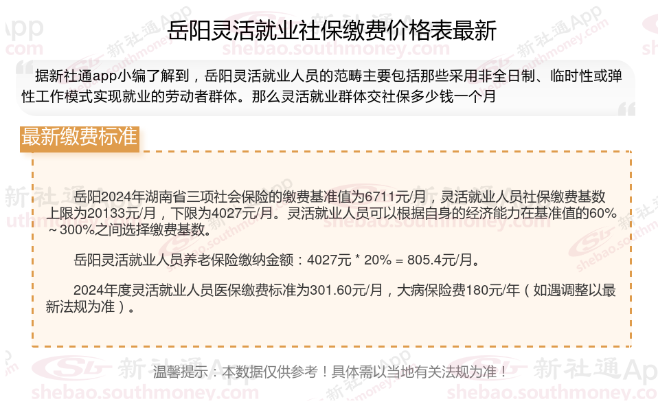 据新社通app数据显示,岳阳企业灵活就业养老保险的缴费基数为:4027元。