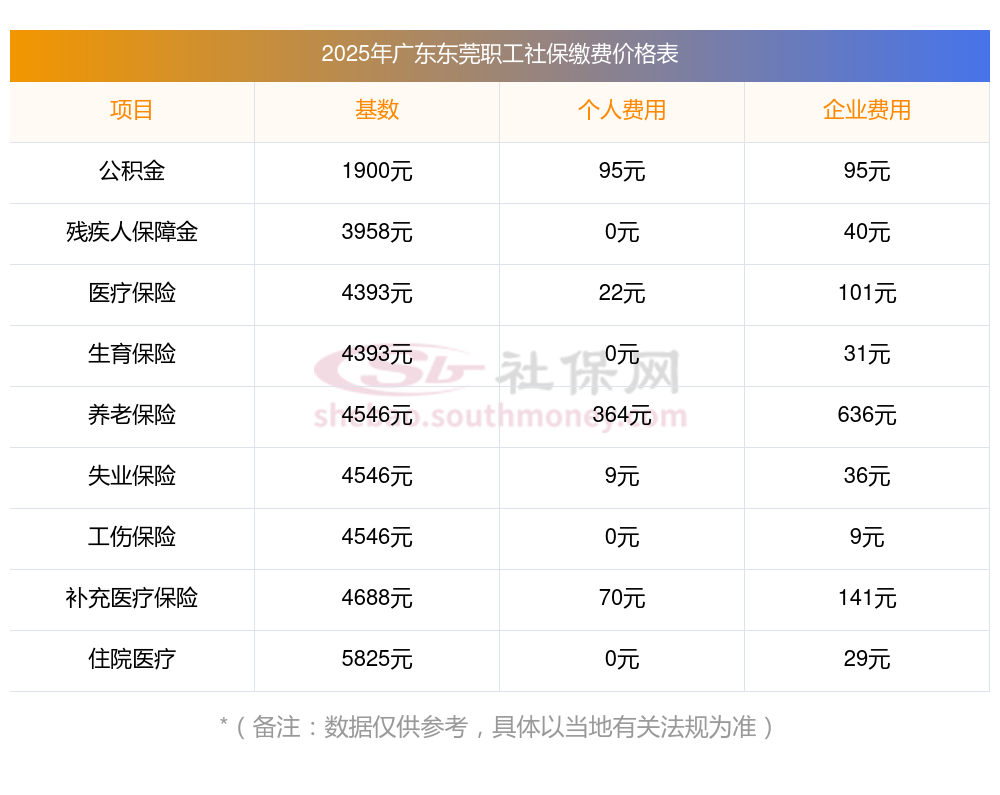 2025年广东东莞社保缴费多少钱?社保要缴够多少年可以退休?下表是2024-2025年广东东莞社保费用明细参考,新社通app-社保缴费查询工具提供的最新数据如下: