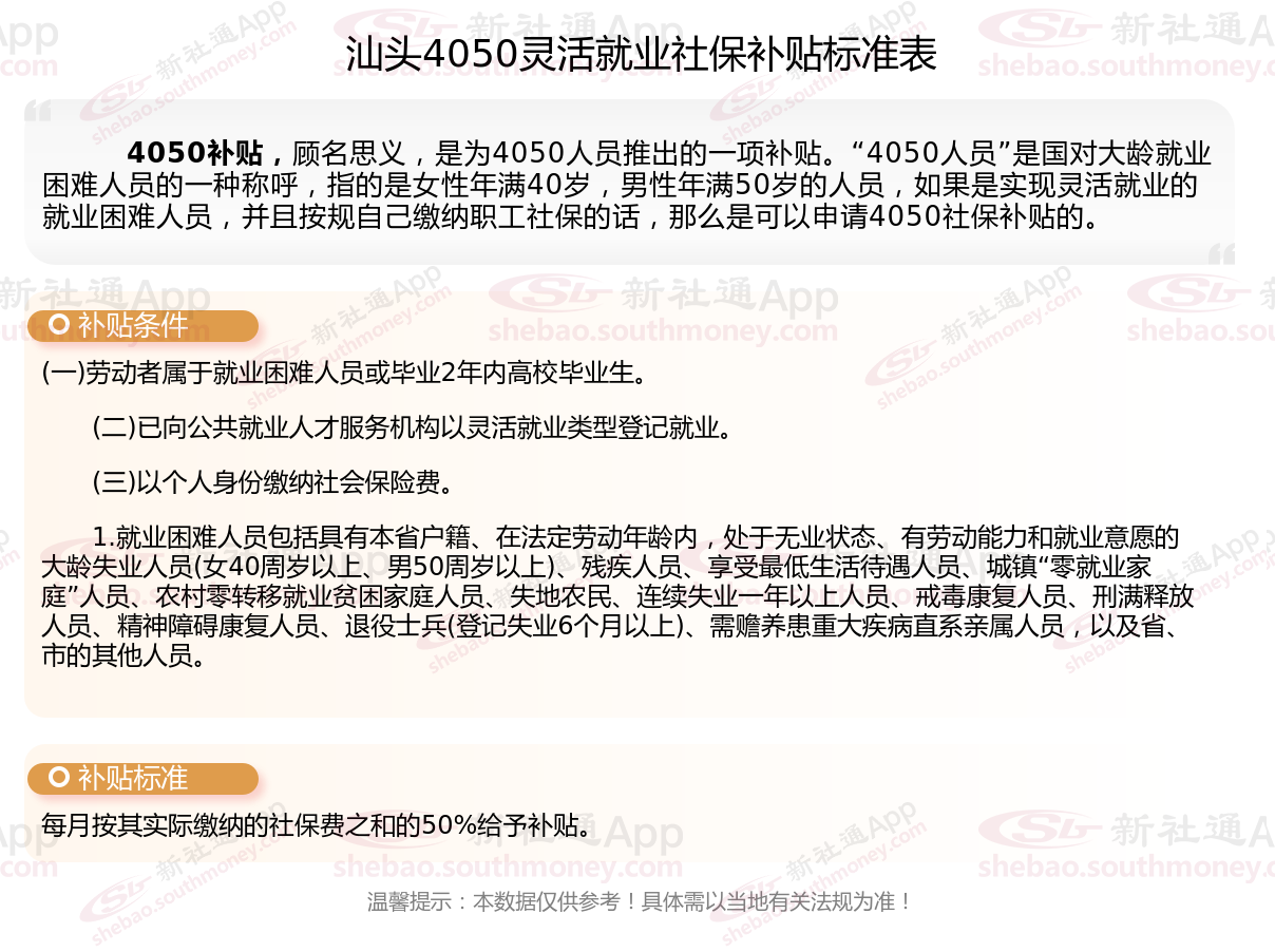 一、汕头灵活就业人员4050补贴最新标准2025年,汕头4050灵活就业人员养老补贴一年可以有多少钱?