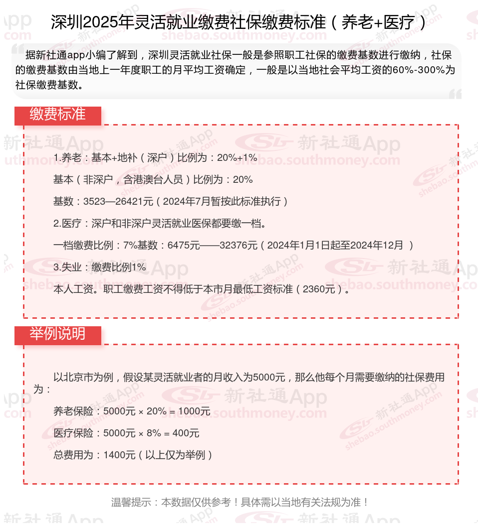 据新社通app数据显示,2024-2025年深圳灵活就业人员养老保险的缴费标准是根据缴费基数来确定的: