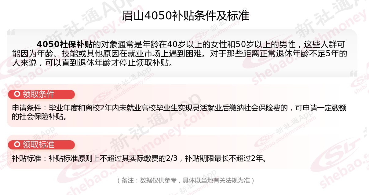 二、2025年眉山4050社保补贴标准及条件,最新如下: