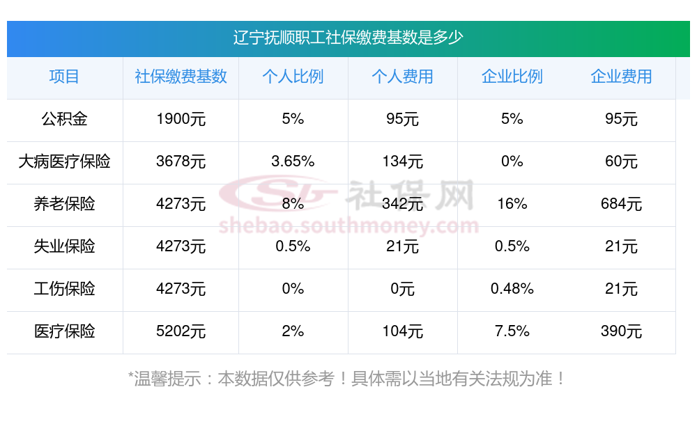 2025年辽宁抚顺社保缴费多少钱?下表是2024-2025年辽宁抚顺社保费用明细参考,新社通app-社保缴费查询工具提供的最新数据如下: