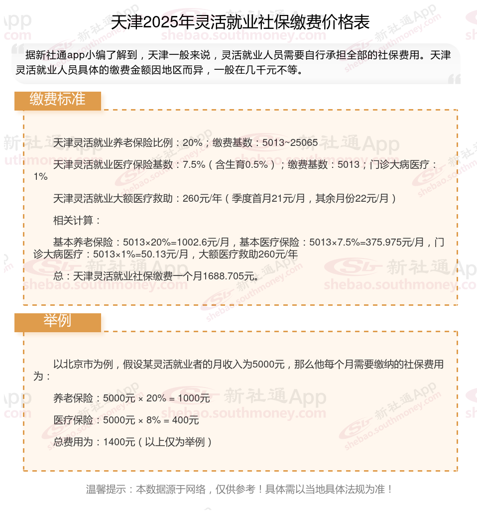 据新社通app数据显示,2024-2025年天津灵活就业人员养老保险的缴费标准是根据缴费基数来确定的:
