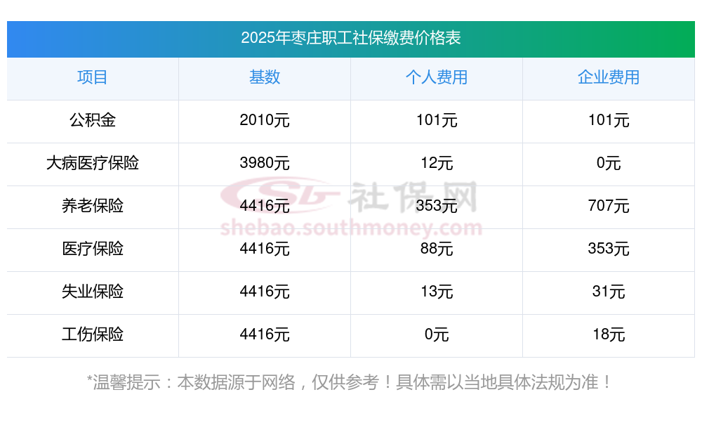 2025年枣庄社保缴费多少钱?下表是2024-2025年枣庄社保费用明细参考,新社通app-社保缴费查询工具提供的最新数据如下: