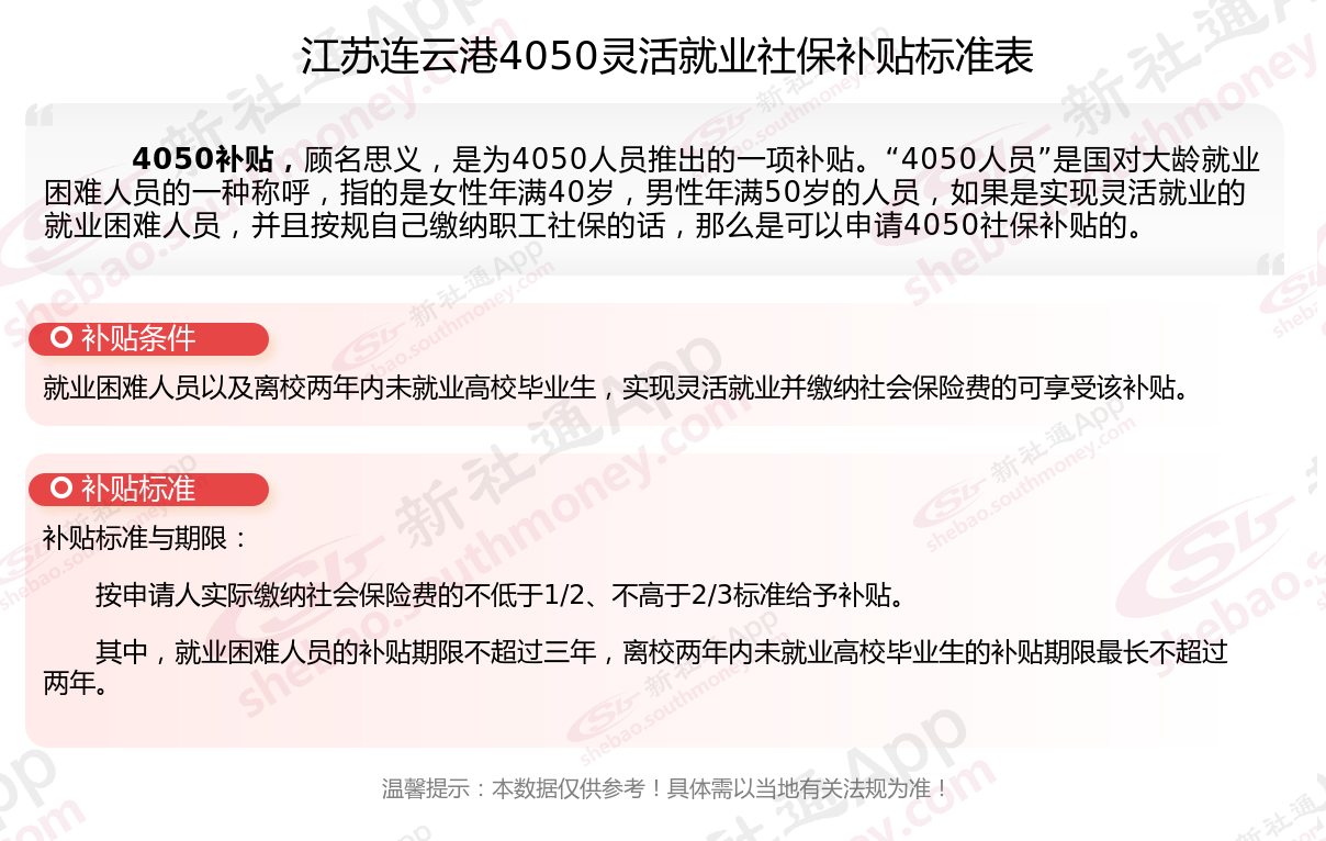 二、江苏连云港4050社保补贴标准及条件(2025年最新)