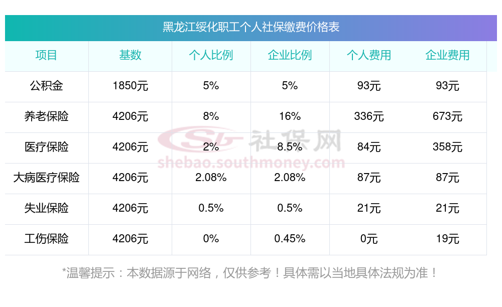 2025年社保多少钱一个月?下表是2024-2025年黑龙江绥化社保费用明细参考,新社通app-社保缴费查询工具提供的最新数据如下:
