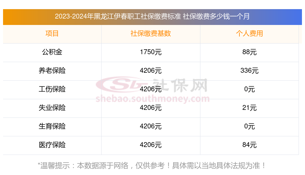 2025年黑龙江伊春社保缴费多少钱?下表是2023-2024年黑龙江伊春社保费用明细参考,新社通app-社保缴费查询工具提供的最新数据如下: