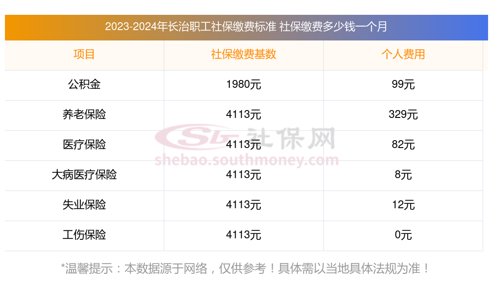 长治五险最少要交多少钱一个月多少钱?下表是2024-2025年长治社保费用明细参考,新社通app-社保缴费查询工具提供的最新数据如下: