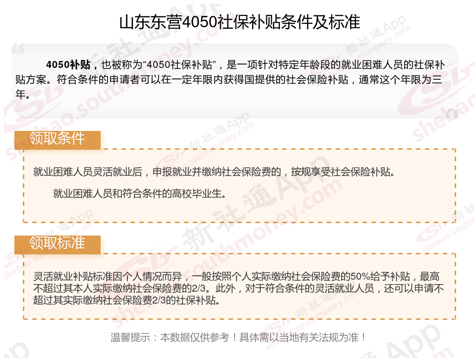 一、2025年山东东营4050社保补贴标准及条件是多少?