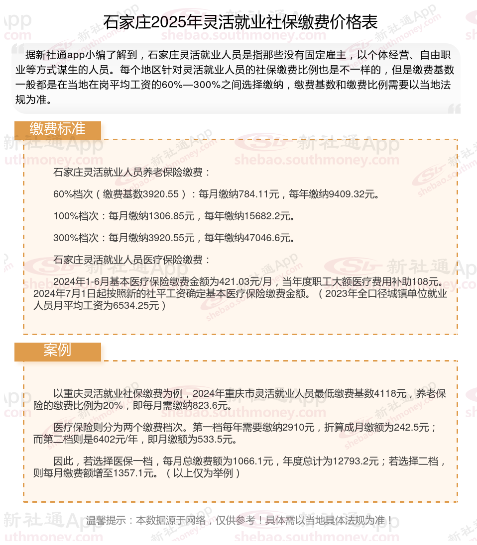 据新社通app数据显示,2024-2025年石家庄灵活就业人员养老保险的缴费标准: