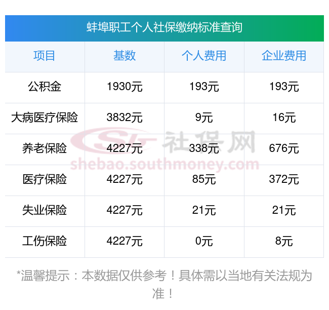 安徽社保多少钱一个月?下表是2024-2025年蚌埠社保费用明细参考,新社通app-社保缴费查询工具提供的最新数据如下: