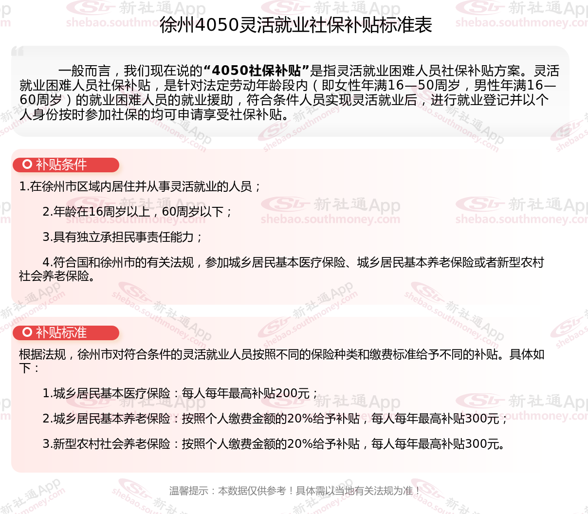 二、2025年徐州4050社保补贴标准及条件,最新如下:
