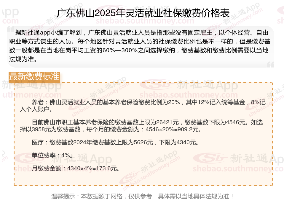 据新社通app数据显示,广东佛山灵活就业人员养老保险缴费基数2024-2025年最新标准如下: