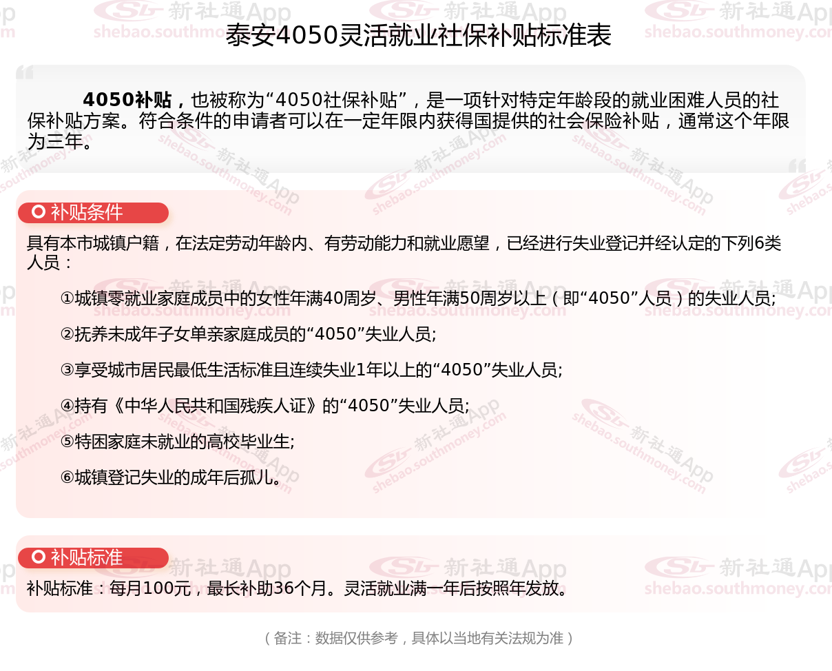 4050补贴主要是针对大龄就业困难人群的社保补贴,申请条件包括年龄、就业困难、灵活就业并自费缴纳社保,需要持有失业登记证,不同地区可能有细微差别,比如农村户口的限制。那么泰安4050灵活就业社保补贴标准是多少钱?泰安4050社保补贴条件是什么?接下来随新社通APP小编了解一下最新资讯。