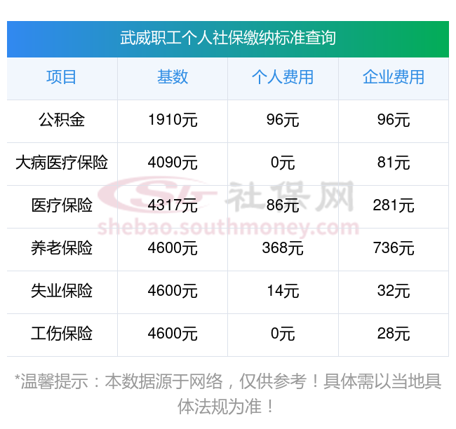 2025年武威社保缴费多少钱?下表是2024-2025年武威社保费用明细参考,新社通app-社保缴费查询工具提供的最新数据如下: