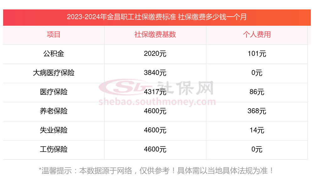 2025年金昌社保缴费多少钱?下表是2023-2024年金昌社保费用明细参考,新社通app-社保缴费查询工具提供的最新数据如下: