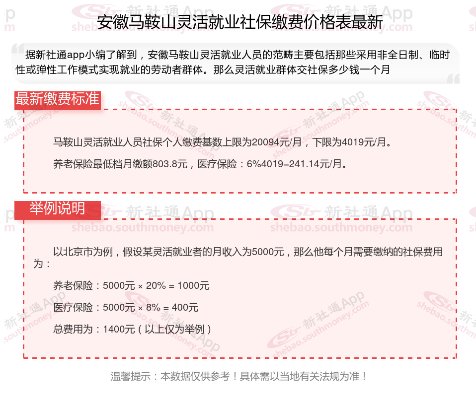 据新社通app数据显示,安徽马鞍山灵活就业养老保险缴费基数2024-2025年最新标准如下: