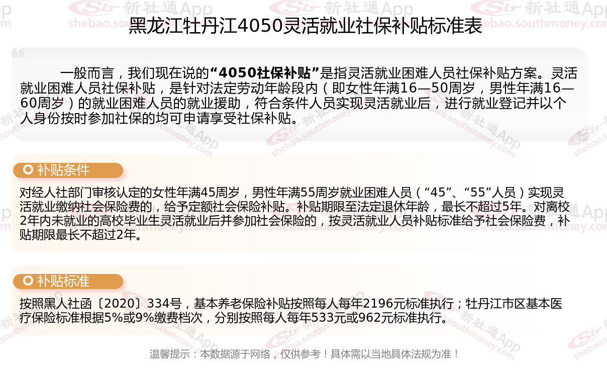 一、黑龙江牡丹江4050社保补贴标准及条件2025年最新消息