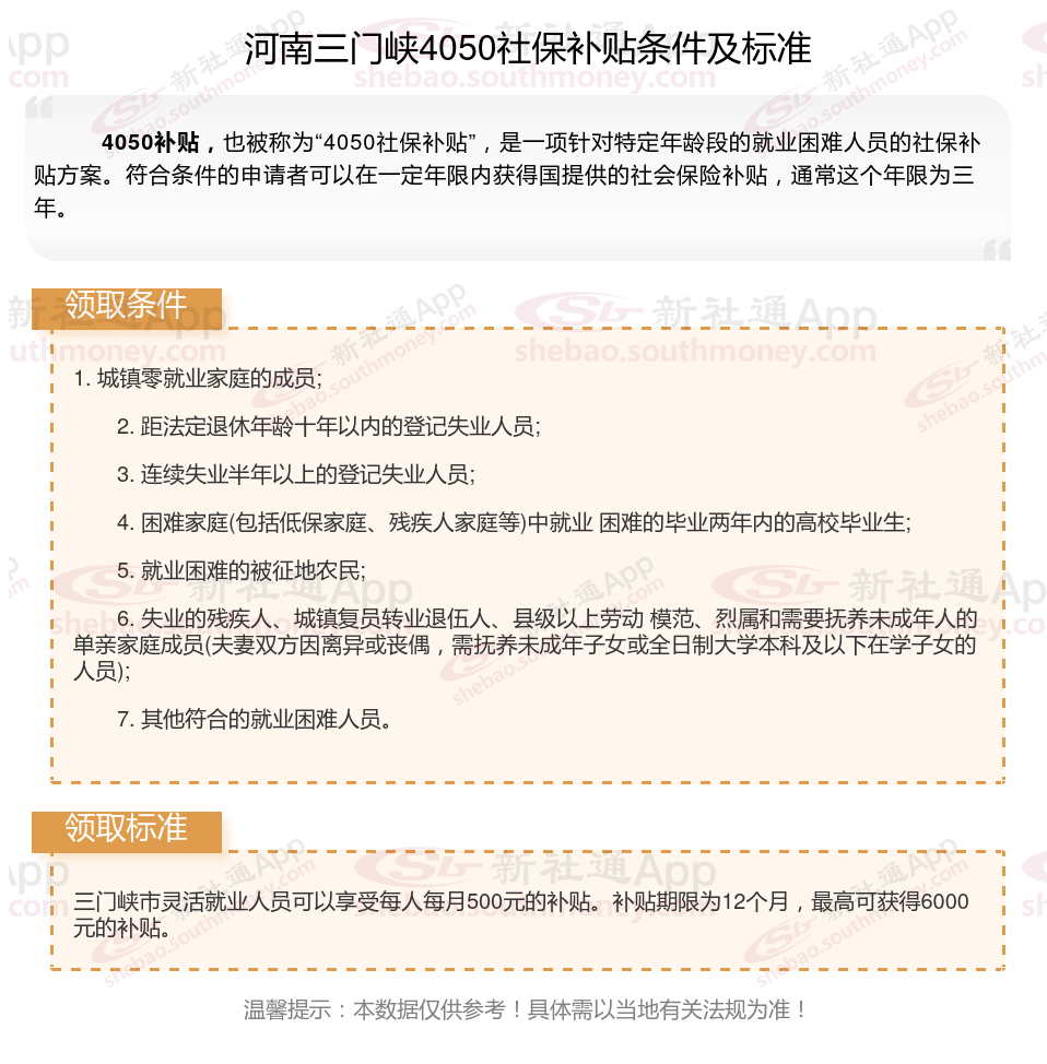二、河南三门峡4050社保补贴标准及条件2025年最新消息
