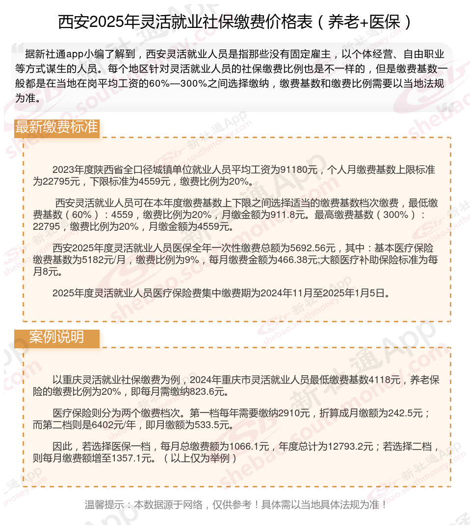 据新社通app数据显示,西安企业灵活就业养老保险的缴费基数为:4559元。