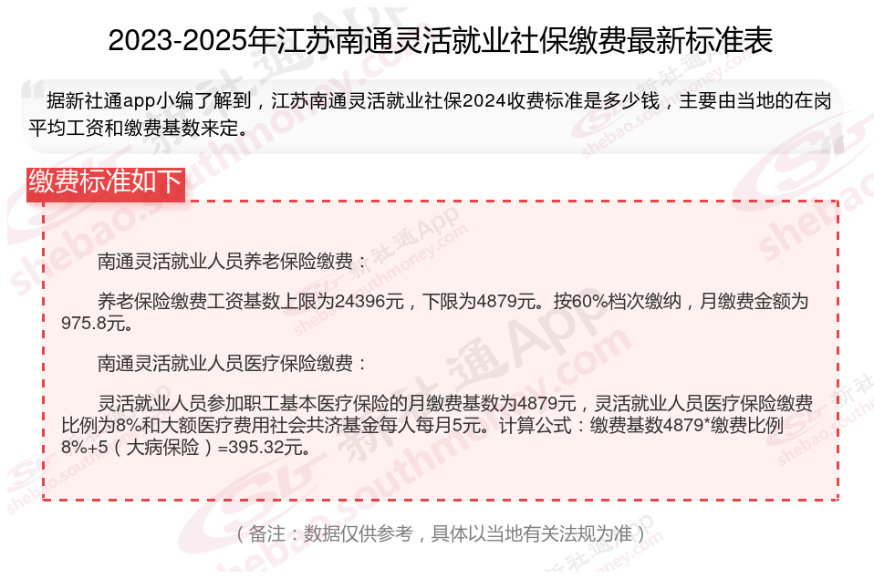 据新社通app数据显示,江苏南通灵活就业养老保险缴费基数2024-2025年最新标准如下: