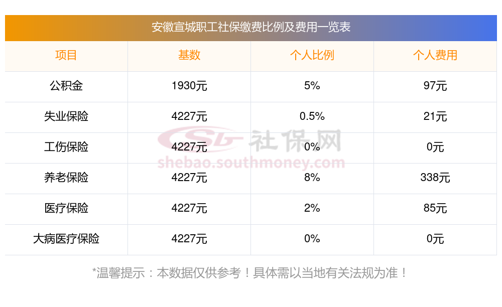 2025年安徽宣城社保缴费多少钱?下表是2023-2024年安徽宣城社保费用明细参考,如下: