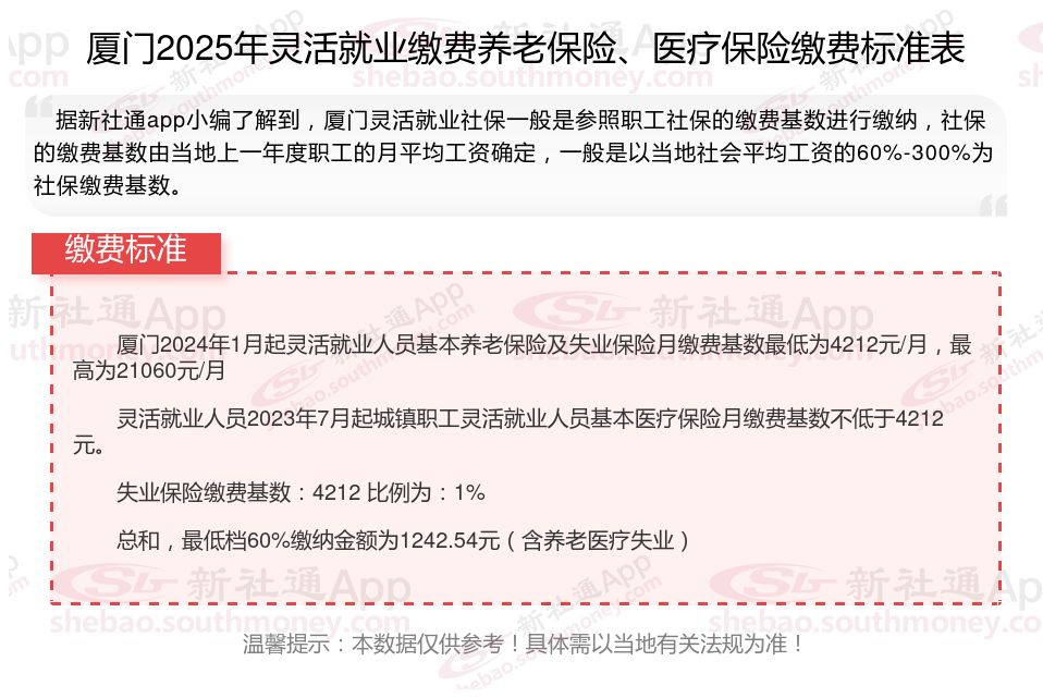 据新社通app数据显示,厦门灵活就业养老保险的缴费基数为:4212元。灵活就业人员参保缴费的比例为个人20%。