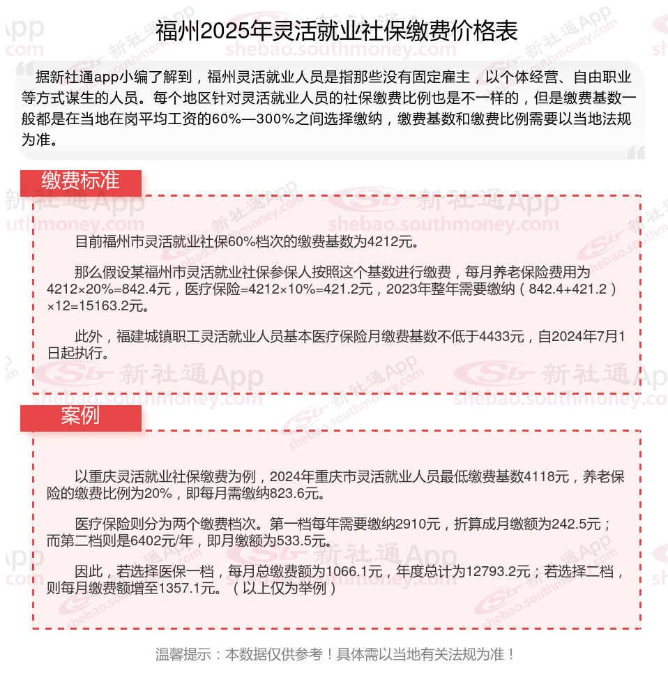 目前福州市灵活就业社保60%档次的缴费基数为4212元。