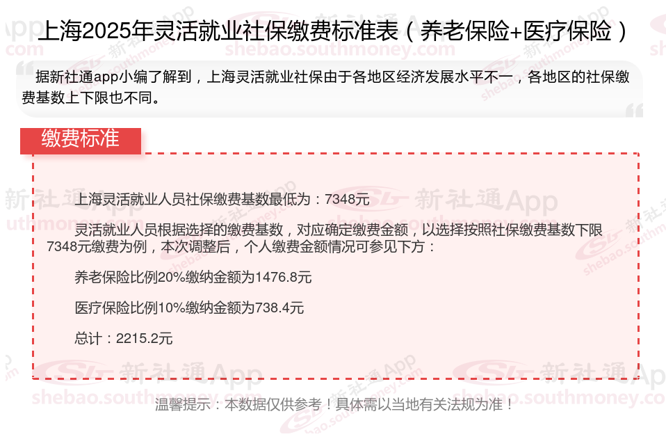 据新社通app数据显示,上海灵活就业人员养老缴费基数2024-2025年最新标准如下: