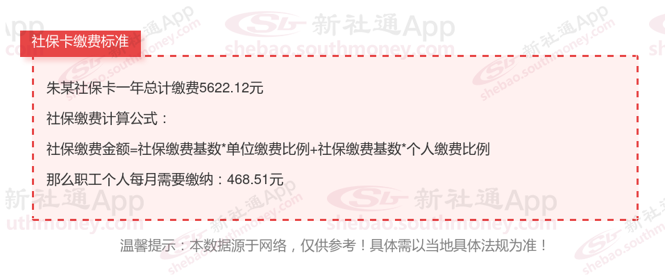 由上图得知,朱某社保卡一年需要缴纳5622.12元,个人部分每月需要缴纳468.51元,若您想要了解明细点击新社通社保计算器,来了解一下明细吧。