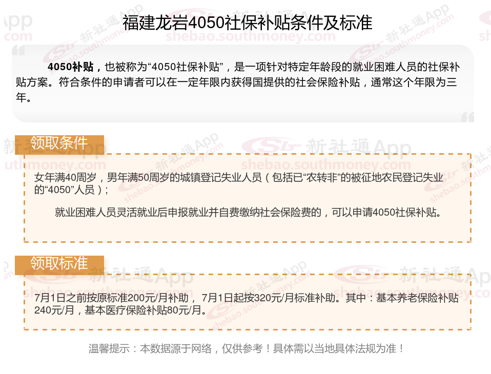 4050补贴需要以灵活就业身份参加职工养老和医疗保险,补贴标准不超过实际缴费的三分之二,最长3年,距离退休不足5年的可延长到退休。补贴对象包括国企下岗人员、低保家庭等。申请流程需要提交身份证、银行账户等。那么福建龙岩4050灵活就业社保补贴标准是多少钱?福建龙岩4050社保补贴条件是什么?接下来随新社通APP小编了解一下最新资讯。