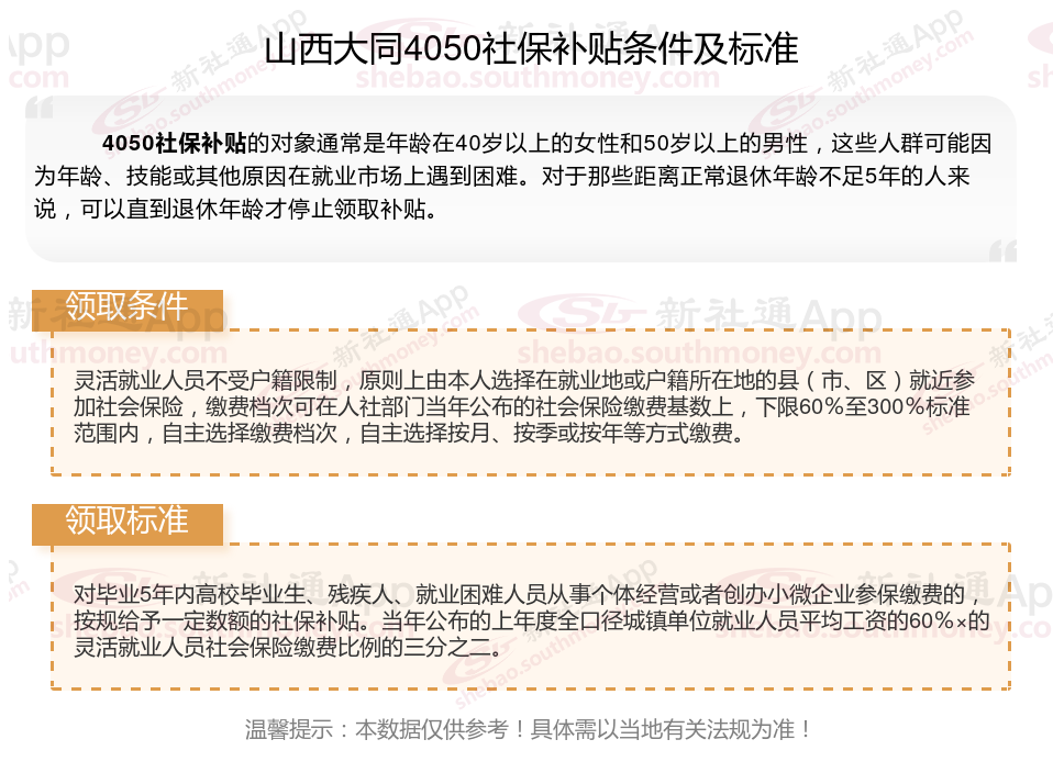 2025山西大同灵活就业4050社保补贴是一项面向特定年龄段的就业困难人群的社会保险补贴。
