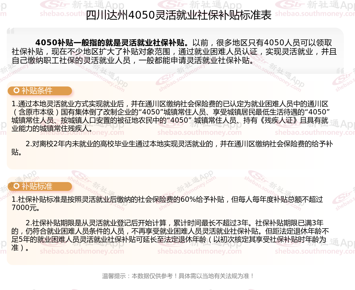 以上就是四川达州4050灵活就业社保补贴的相关内容,欢迎关注新社通/下载新社通APP了解更多五险一金专业资讯。
