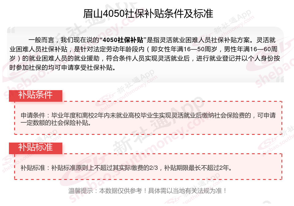 一、眉山4050社保补贴标准及条件2025年最新消息