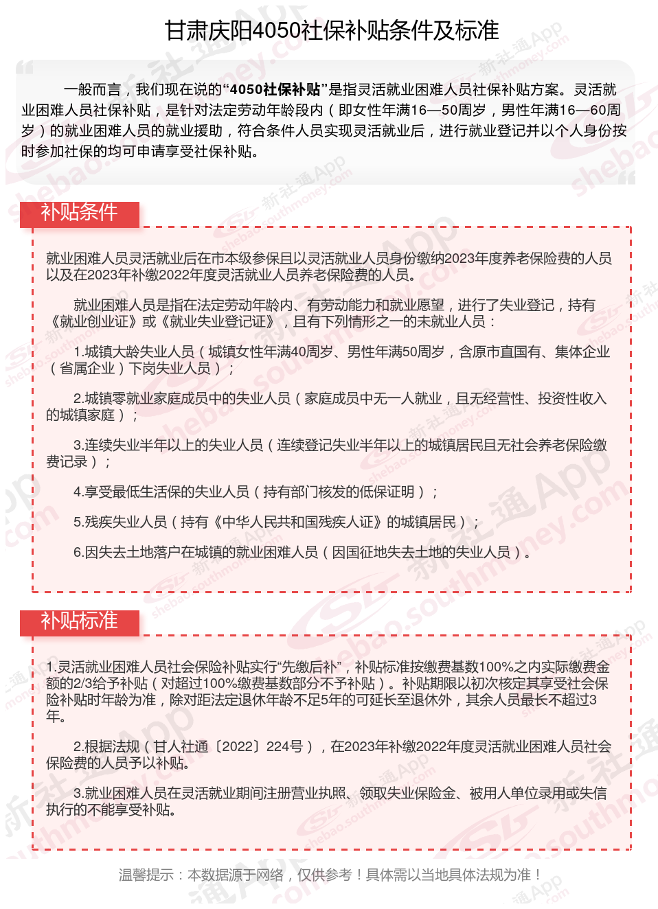 二、甘肃庆阳4050社保补贴标准及条件2025年最新消息