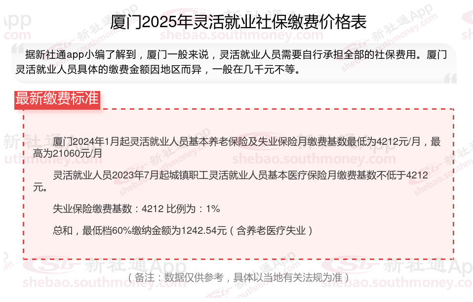2025厦门灵活就业社保缴费价格是多少钱一个月?根据新社通app-社保缴费查询工具提供的最新数据如下: