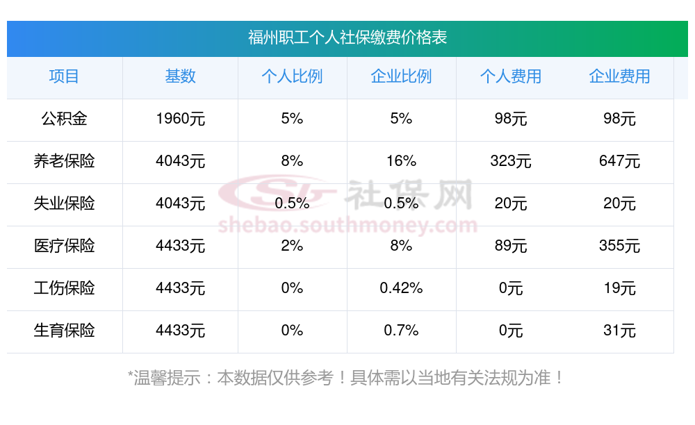 2025年福州5险缴费标准是多少,2025年福州社保缴费多少钱?下表是2025年福州社保费用明细参考,新社通app-社保缴费查询工具提供的最新数据如下: