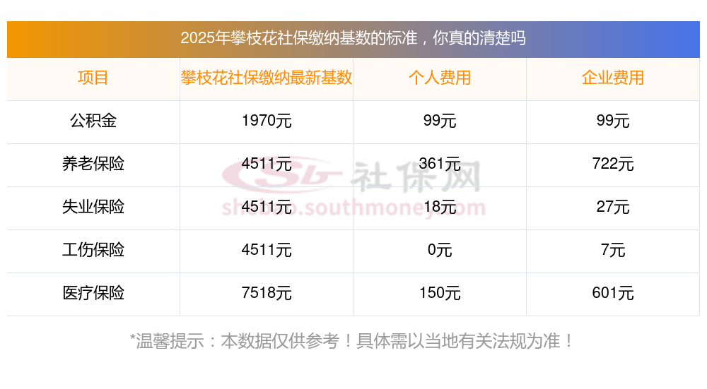 职工五险一个月交多少钱 公司加个人是多少?下表是2024-2025年攀枝花社保费用明细参考,新社通app-社保缴费查询工具提供的最新数据如下: