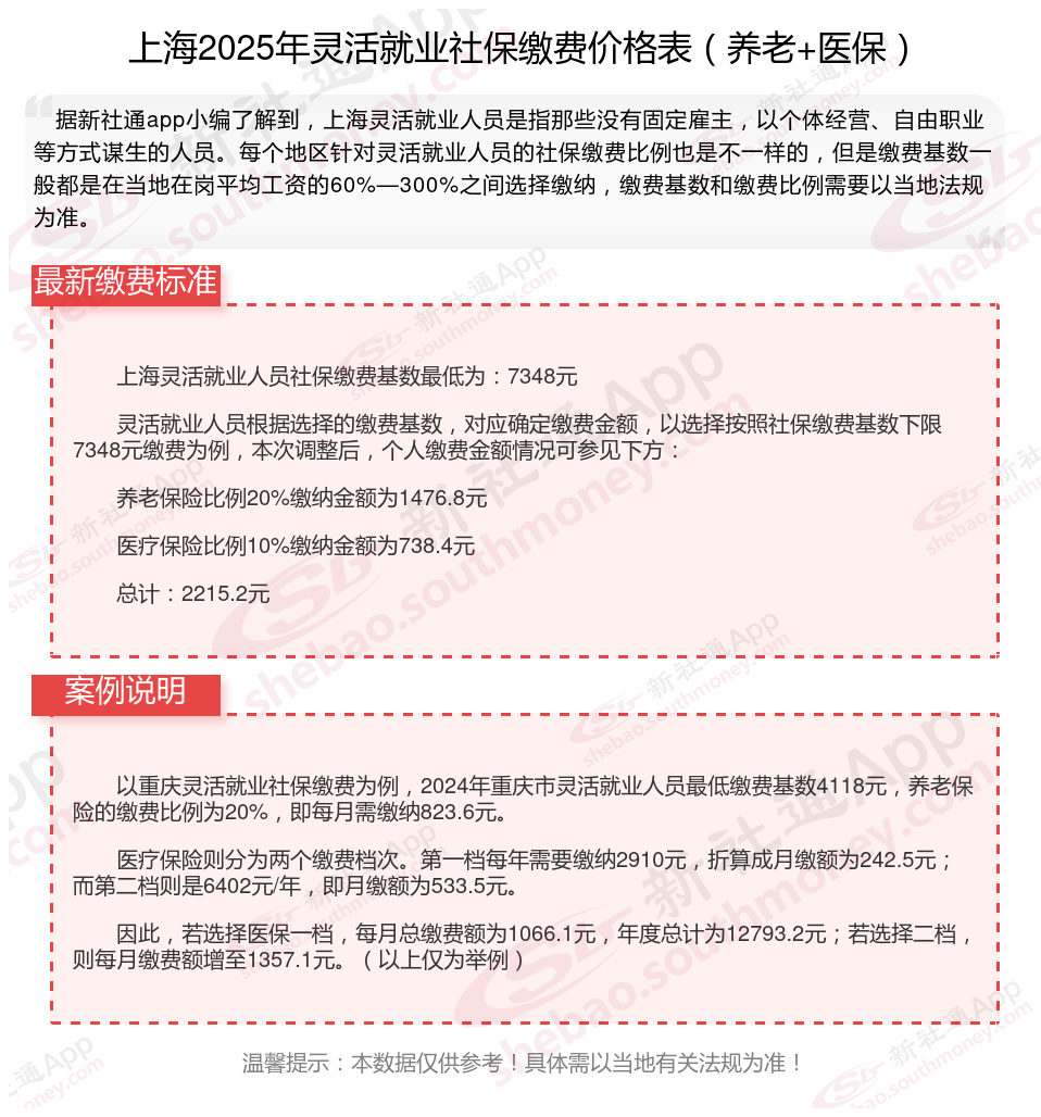 #上海灵活就业人员社保缴费2025年# 在当前的社保体系中,灵活就业人员作为特殊的群体,其社保缴费问题备受关注。本文就上海灵活就业人员社保缴费的种类和具体比例、费用,具体谈谈灵活就也人员的社保相关问题。下面随新社通小编一起来看看。