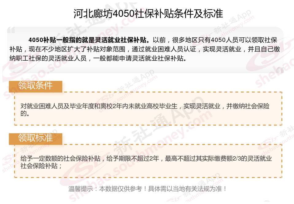 4050补贴主要是针对大龄就业困难人群的社保补贴,申请条件包括年龄、就业困难、灵活就业并自费缴纳社保,需要持有失业登记证,不同地区可能有细微差别,比如农村户口的限制。那么河北廊坊4050灵活就业社保补贴标准是多少钱?河北廊坊4050社保补贴条件是什么?接下来随新社通APP小编了解一下最新资讯。