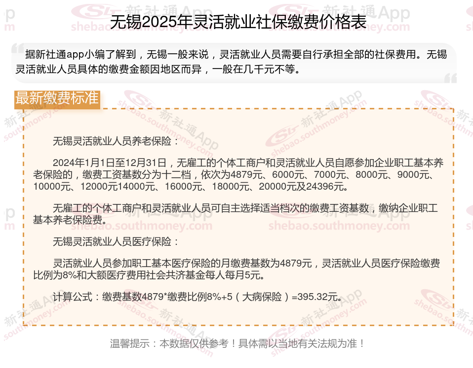 据新社通app数据显示,无锡灵活就业养老保险的缴费基数为:4494元。灵活就业人员参保缴费的比例为个人20%。