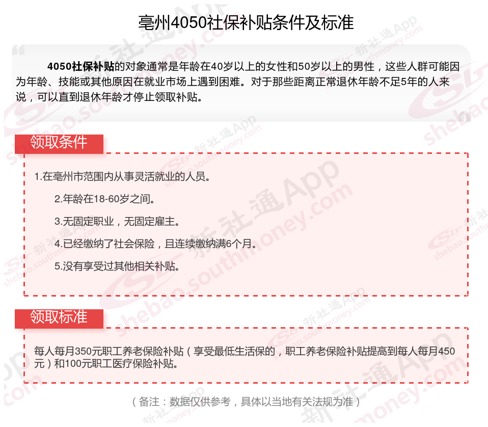 一、最新亳州4050社保补贴标准及条件